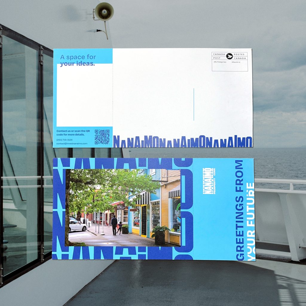 What we did: For Nanaimo Prosperity Corporation (NPC), we created a cohesive marketing suite. Our graphic designers included WCAG-compliant colour adjustments, refined typography and guidelines, corporate collateral like Google Slides, business cards, and letterhead, and a custom Canva content suite. Our copywriters and graphic designers collaborated on event postcards with perforated contact cards, and a flexible three-banner pop-up system.