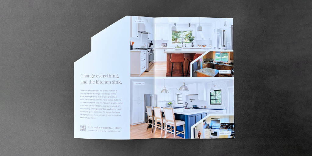 What we did: We created a three-part direct mail campaign for MAC Reno Design Build to drive awareness and generate leads for kitchen renovations. Our copywriting team used bold headlines and emotionally-driven copy to connect with homeowners. Our graphic designers used strategic die-cuts that peek into a dream kitchen paired with before-and-after imagery to spark curiosity.
