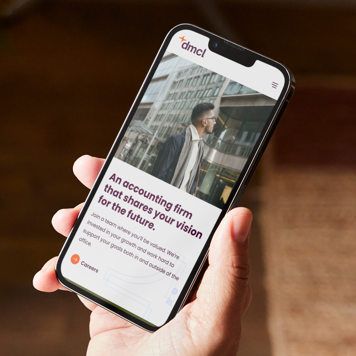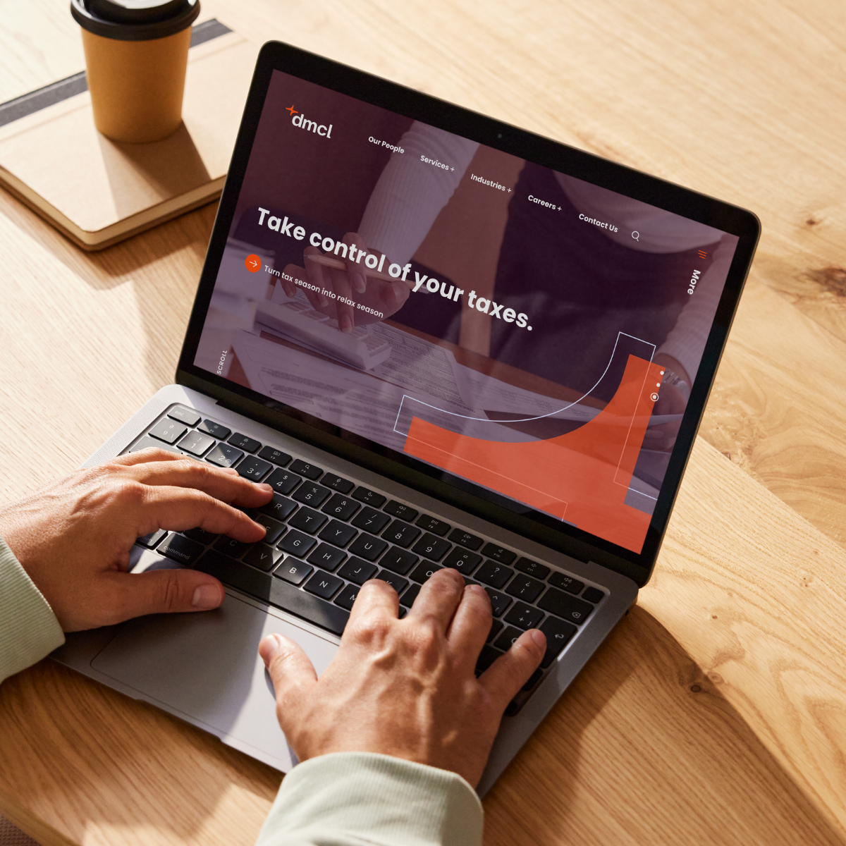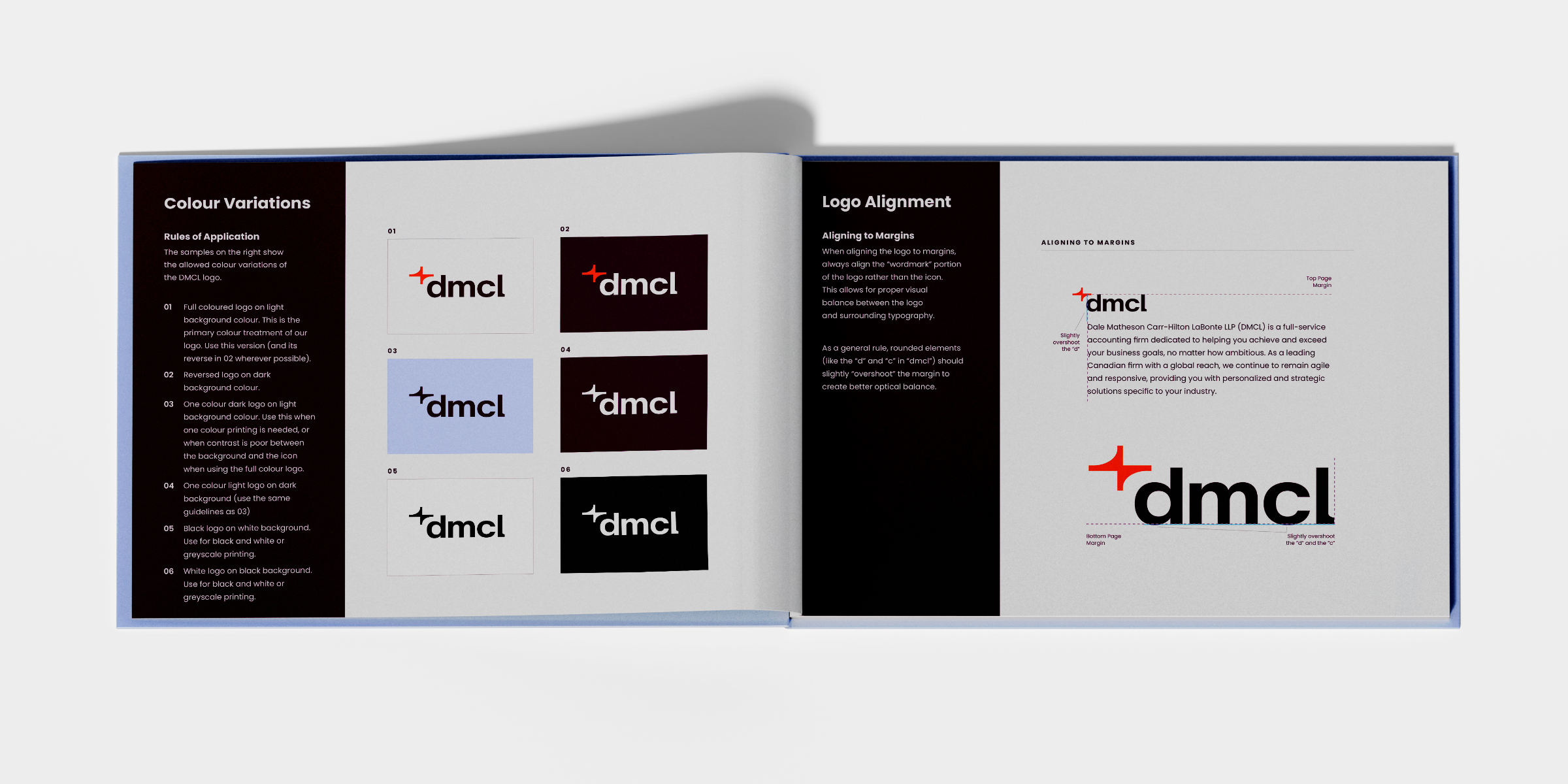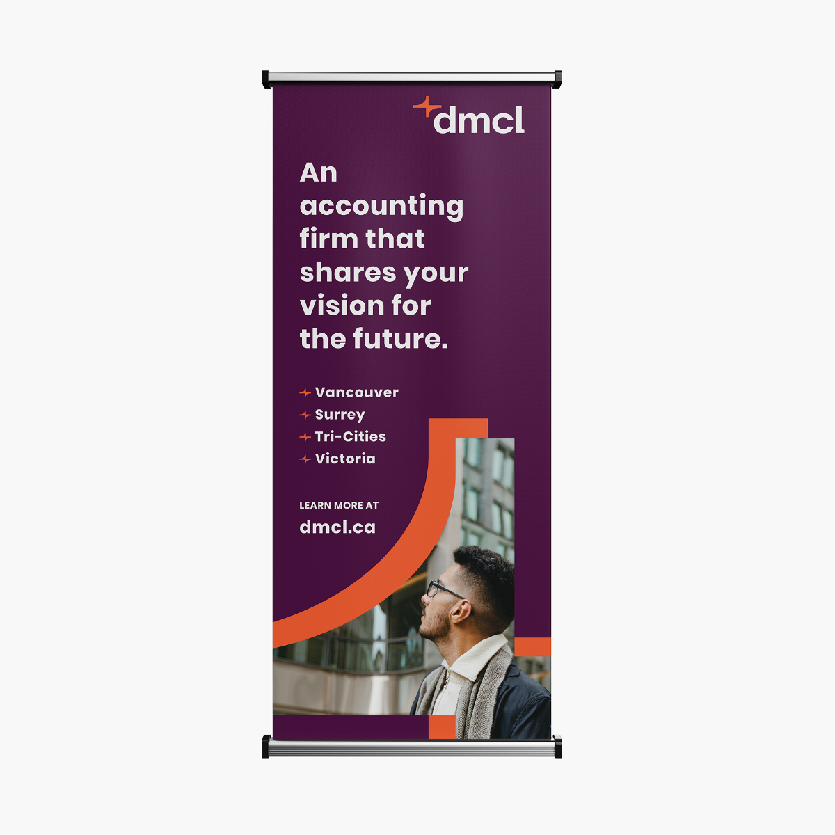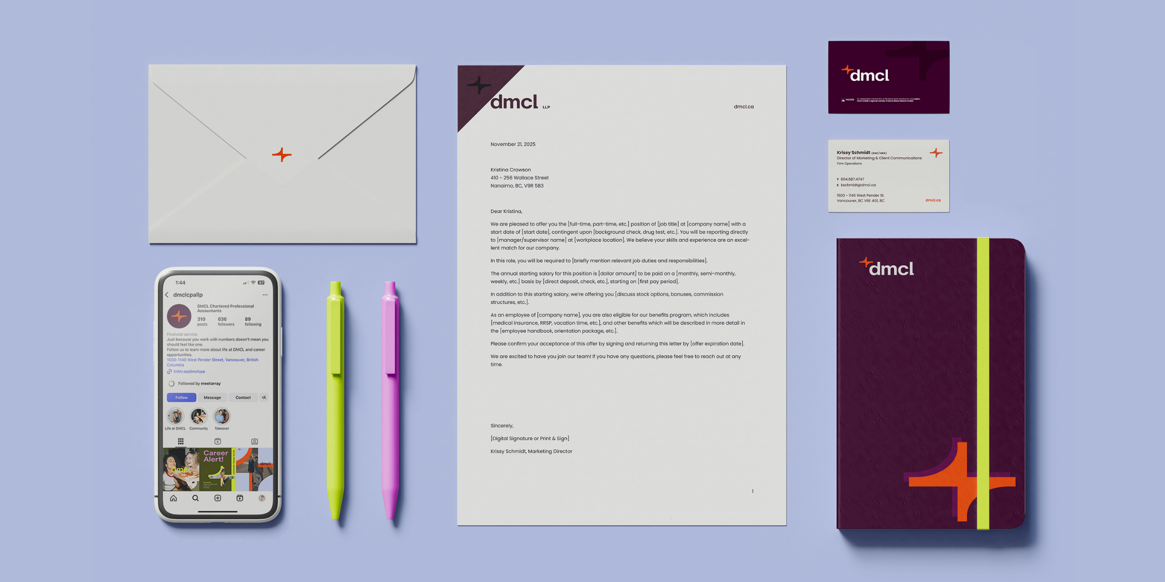 - For the logo design, our design team centred the rebrand around a custom-designed wordmark with an icon. At first glance, the icon reads as a plus sign, a familiar symbol of value in accounting. Looking closer, it reveals an upward graph, reflecting DMCL’s commitment to client growth and forward momentum. The shape also subtly echoes the structure of Vancouver’s Lions Gate Bridge, a local landmark that represents connection, progress, and partnership, all central to how DMCL operates.