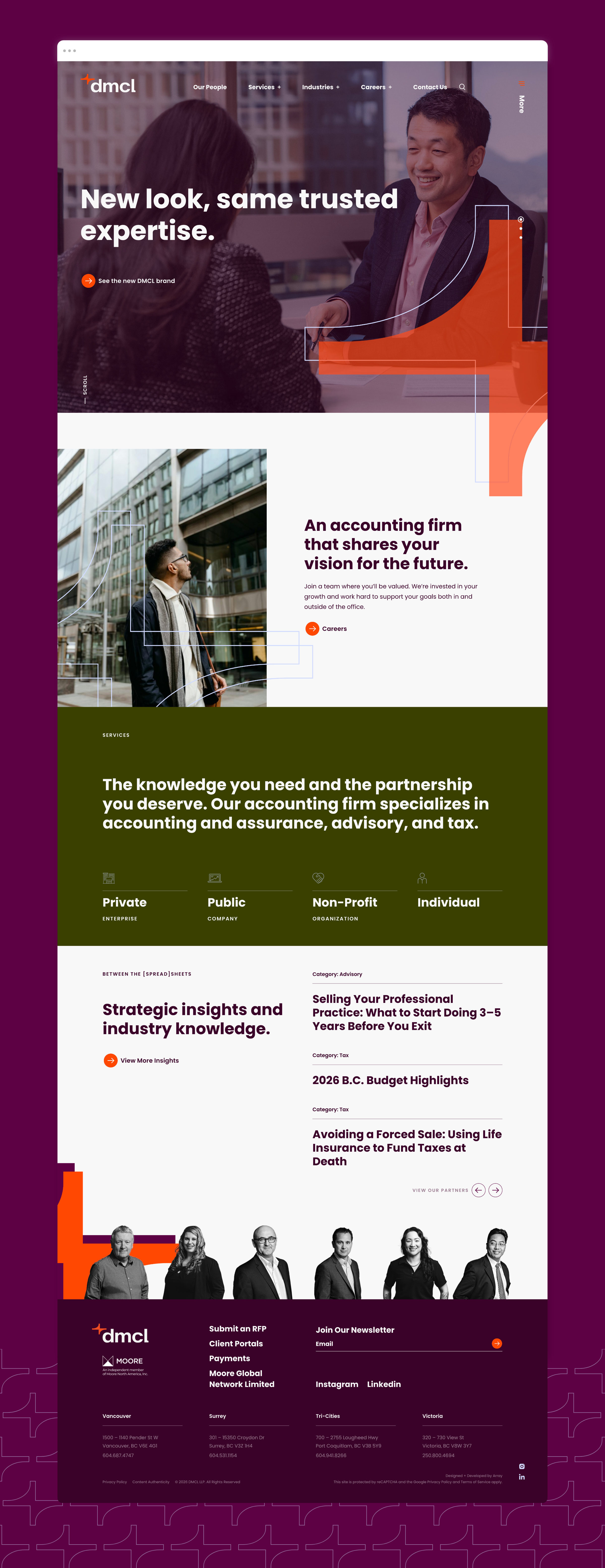 DMCL LLP is a full-service BC firm with over 300 team members across offices in Vancouver, Surrey, Tri-Cities, and Victoria. Built through decades of mergers and growth, DMCL had earned a reputation as a trusted, relationship-driven alternative to the Big 4.